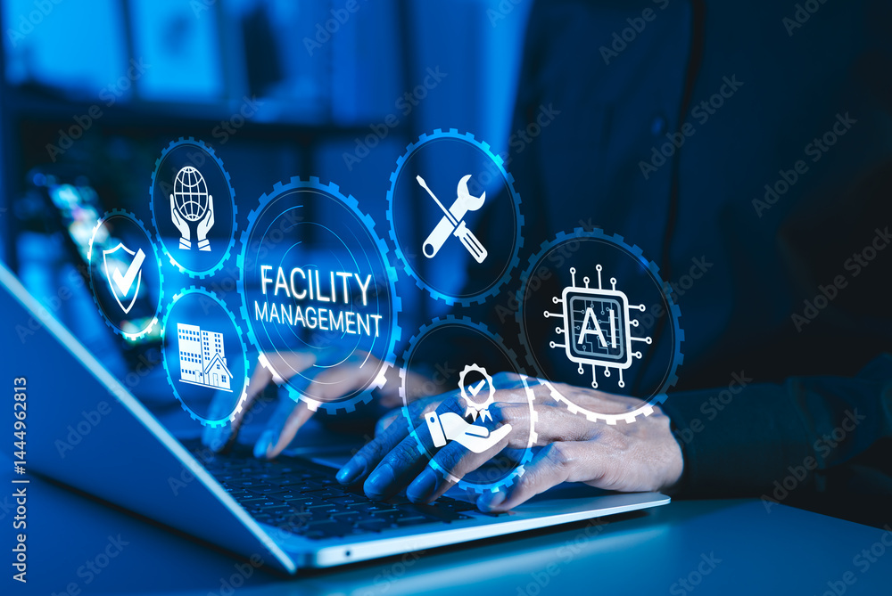 Facility Management and Digital Solutions Concept. Icons related to facility management, maintenance, AI, IoT, security, and optimization. integration of technology in managing facilities efficiently.