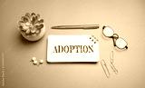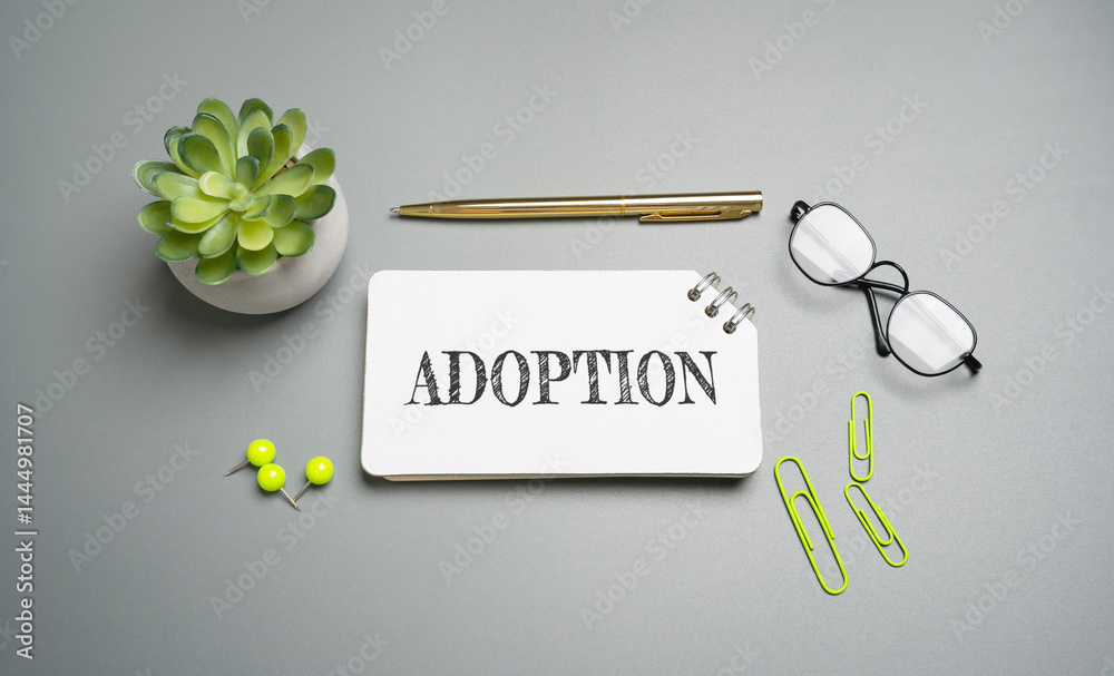 Adoption concept. Legal process through which a person or couple becomes the permanent, legal parents of a child who is not their biological offspring. Notes with message
