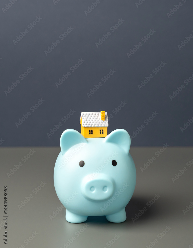 Piggy bank with little house. Concept of buying, selling or renting a home. Mortgage, loan, real estate. Copy space
