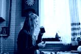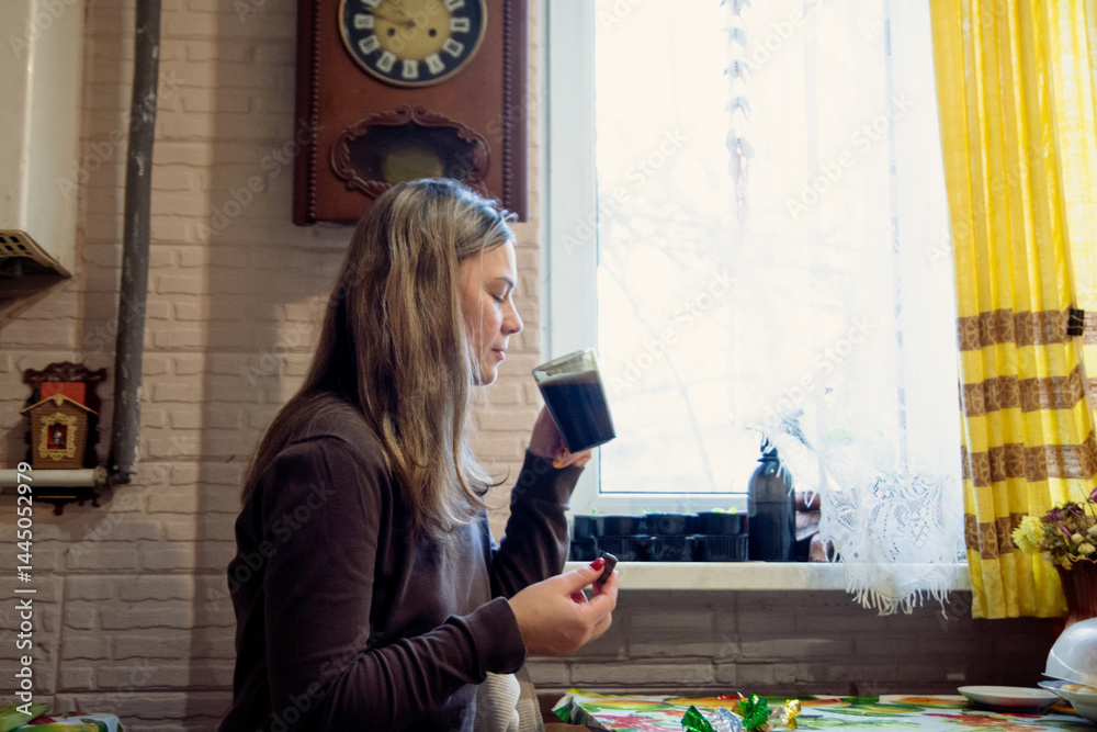 A Young Woman Enjoys a Warm Beverage and a Snack in a Cozy Kitchen Setting