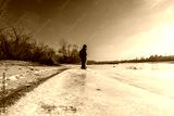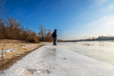 A Solitary Figure Stands at the Edge of a Frozen River on a Bright Winter Day