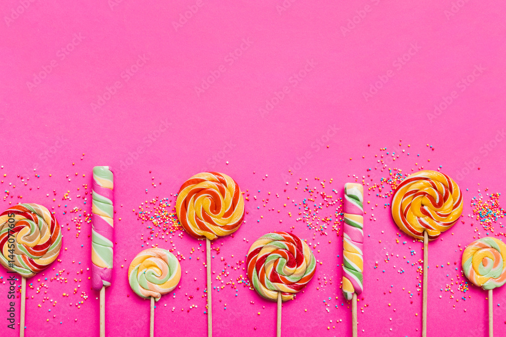 Tasty appetizing Party Accessories Happy Birthday Sweet. Different types of candies on colored background, copy space. Colorful birthday party background