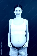 Happy pregnant woman in unzipped jeans showing her naked abdomen at colorful background with copy space