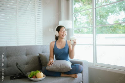 Fit Asian woman in sportswear drinks a protein shake in her kitchen after training, embracing a healthy, active lifestyle indoors.