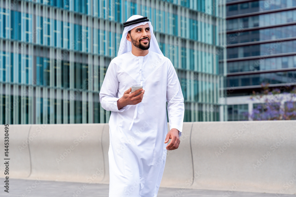 Arab middle-eastern man wearing emirati kandora traditional clothing in the city