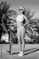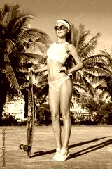 Young woman with a longboard. Trendy casual hipster teenage girl with a skateboard.