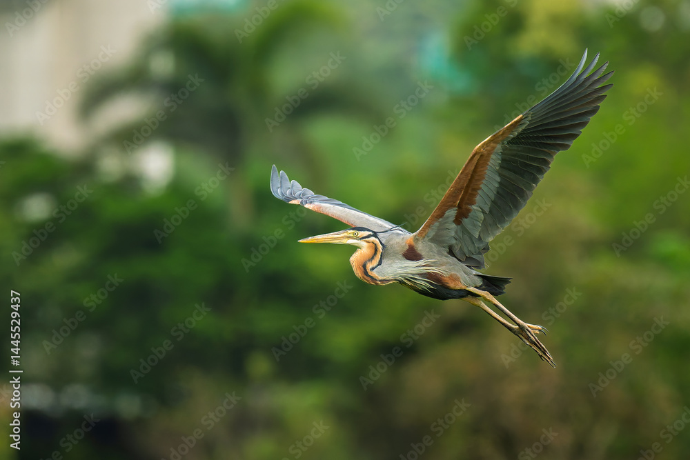 Purple heron in flight with a green background of trees