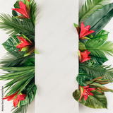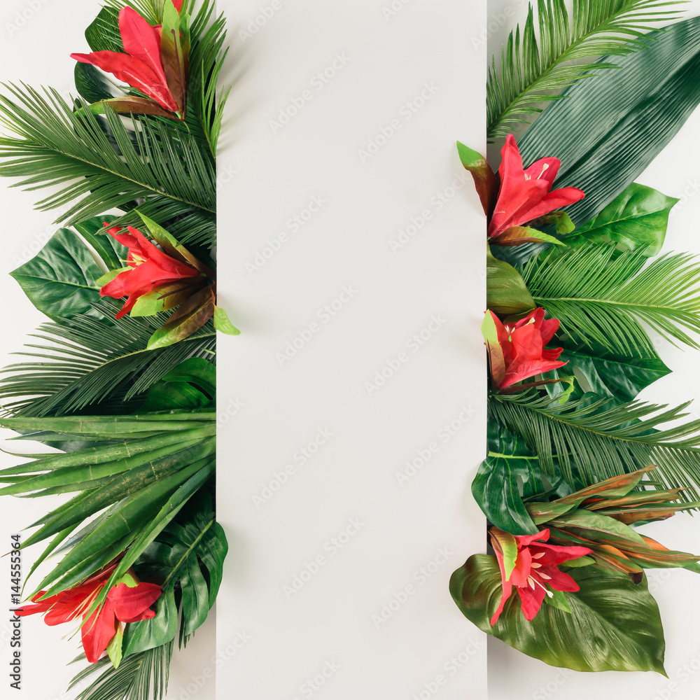 Creative layout made of tropical palm leaves and colorful flowers. Summer concept. Flat lay.