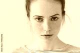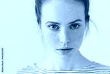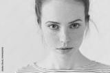 Close up highly-detailed picture of beautiful charming young female with perfect freckled skin, ginger hair and green eyes resting indoors, dressed in sailor t-shirt. Teenage girl posing in studio