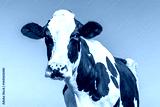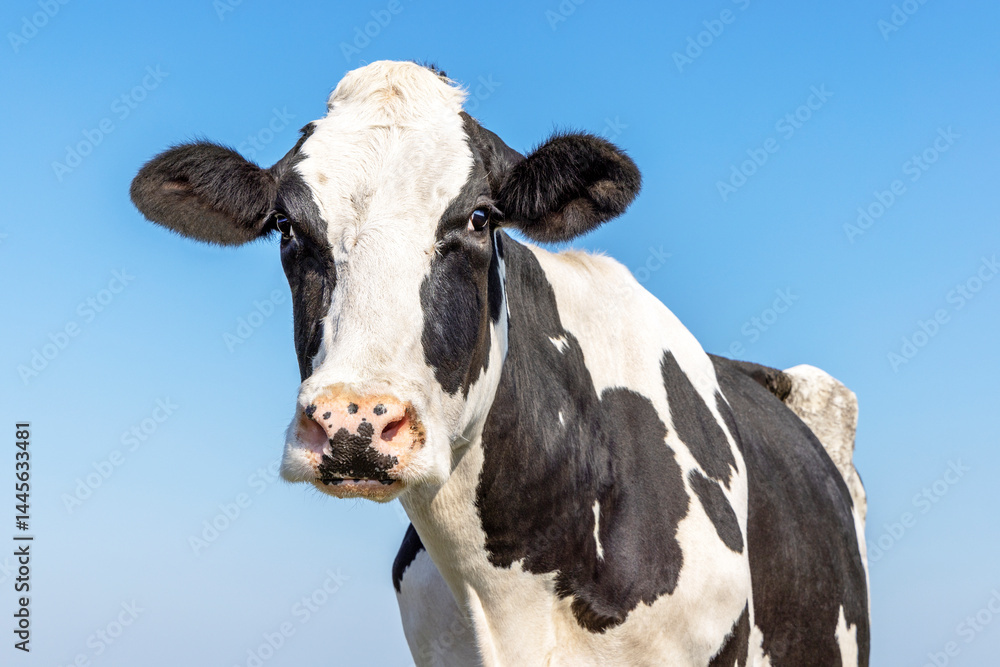 Cow black and white, authentic mature milker cattle, eye contact, a blue sky