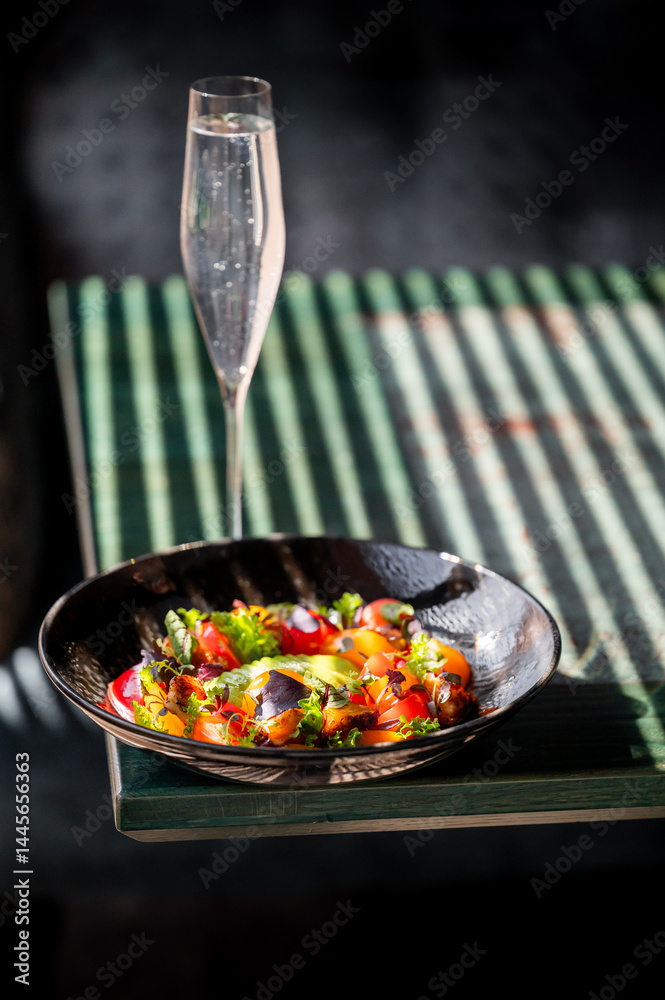 A stylish black plate featuring a colorful salad adorned with fresh vegetables and edible flowers, accompanied by a sparkling drink in a champagne flute on a green table.