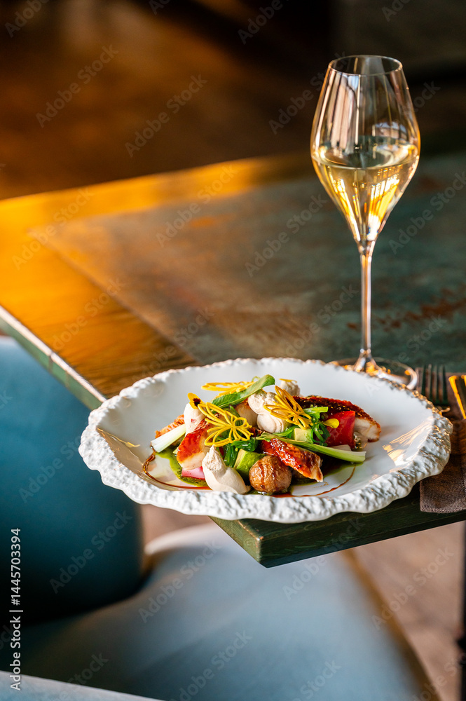A vibrant salad featuring fresh greens, tender chicken, and decorative garnishes on a stylish plate, accompanied by a glass of sparkling wine, exuding elegance and sophistication.