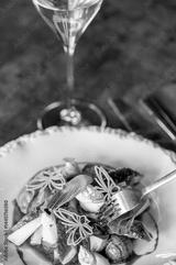 A close-up of a delicious salad with tender chicken, fresh greens, and vibrant garnishes on a decorative plate, paired with a glass of sparkling wine, highlighting fine dining elegance.