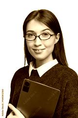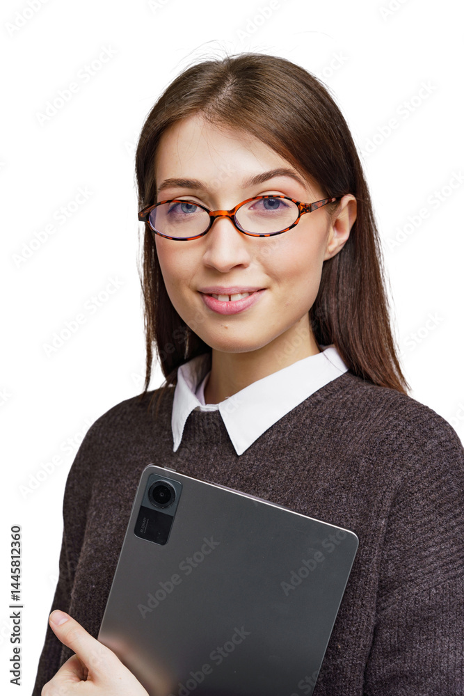 Young woman with glasses holding a tablet, smiling warmly in a cozy indoor setting