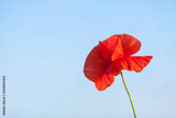 Poppy farming, nature, agriculture concept - close up of red blooming poppy flower over blue sky background - empty space for text