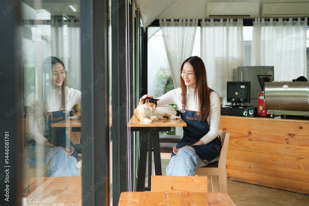 Small business owners enjoying time with a cat in their pet-friendly coffee shop