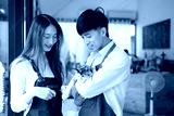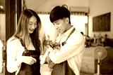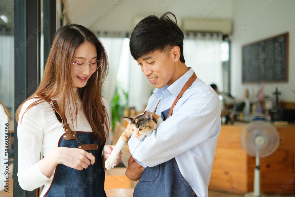 Small business owners enjoying time with a cat in their pet-friendly coffee shop