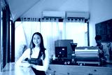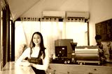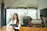 Smiling friendly asian girl barista, wearing apron, working at counter, brewing filter coffee, managing cafe shop