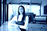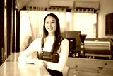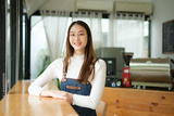 Smiling friendly asian girl barista, wearing apron, working at counter, brewing filter coffee, managing cafe shop
