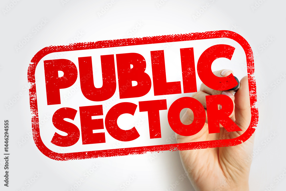 Public Sector is the part of the economy composed of both public services and public enterprises, text concept stamp