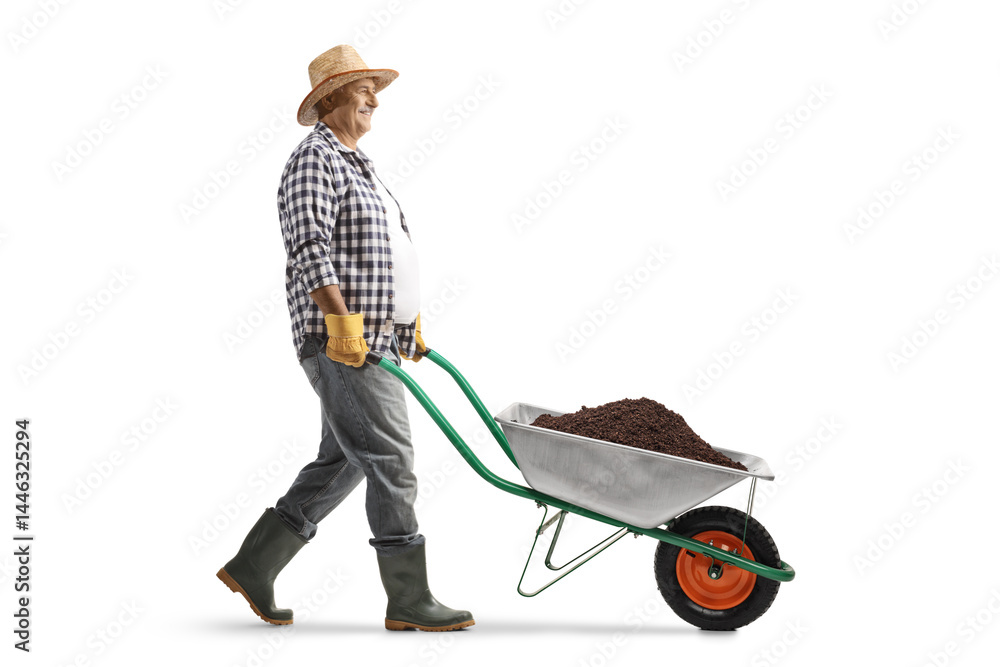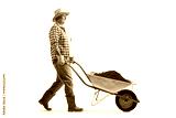 Farmer walking and pushing earth in a wheelbarrow