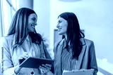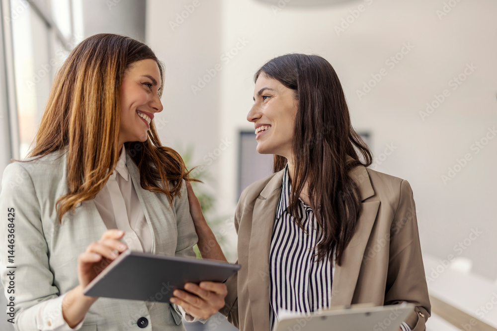 Two successful businesswomen standing at corporate office with paperwork and tablet and discussing while smiling at each other.