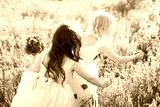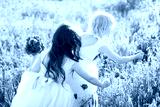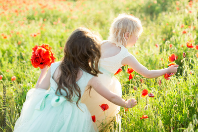 little girl model, wedding fairytale concept - on the meadow two young girls bridesmaid take a flower of poppies for the bride's bouquet, dressed in festive fancy dress white and soft blue color