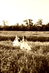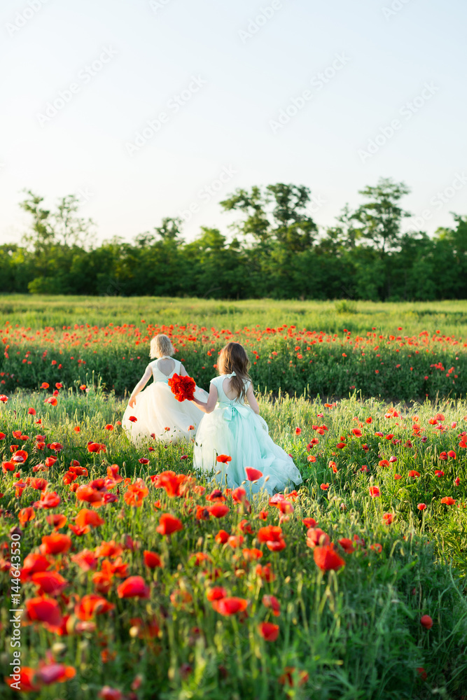 girl model, poppies, childhood, fashion, nature and summer concept - two young girls, sisters in white and blue holiday dresses collect wildflowers in a field of red poppies with trees background