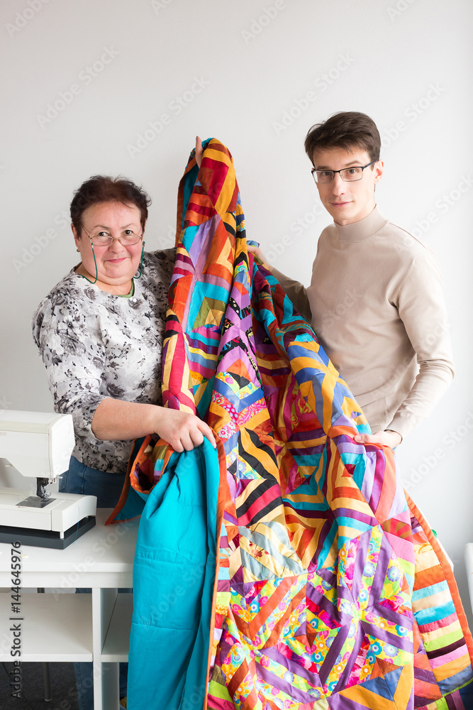 quilting in the workshop of tailors - male and female smiling tailors held together in hands a large bright quilt, sewn from scraps of colored fabric on the sewing machine. Family hobby concept.
