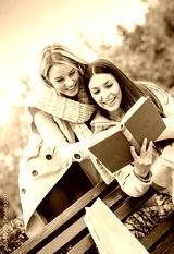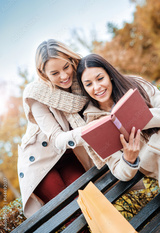 Two young women resting in the park after shopping. Consumerism, relaxation, education, lifestyle concept