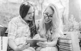 Beautiful women take a break on the park bench after shopping. Consumerism, lifestyle concept