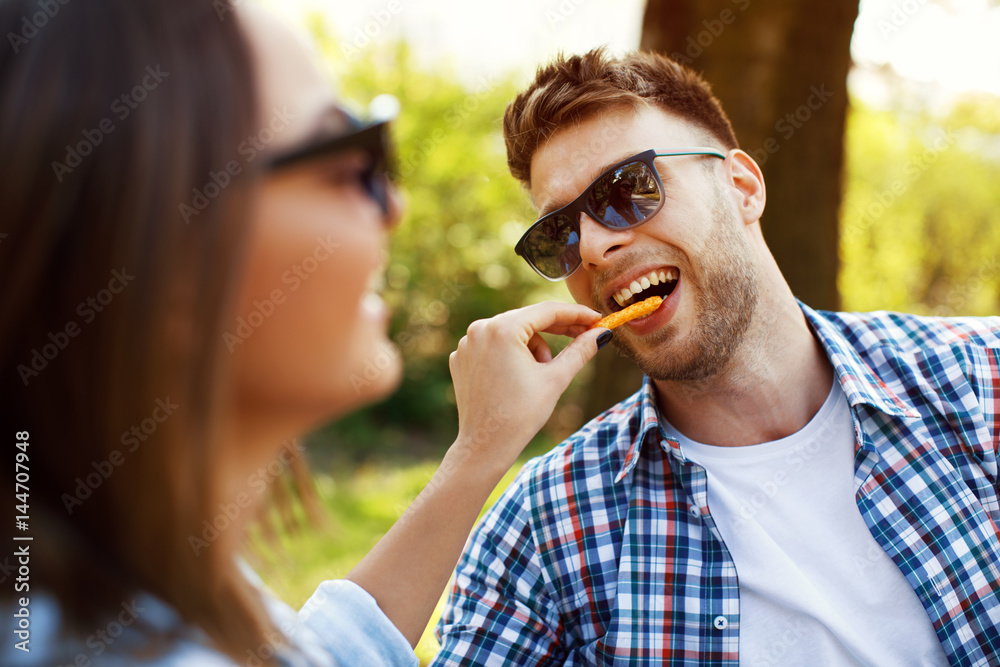 Young couple eating French fries in a park on a sunny day