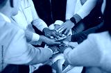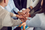 Business multicultural people join hands and place them on top of each other close-up. Concept solidarity and team support, teamwork of colleagues, community, corporate unity, merger