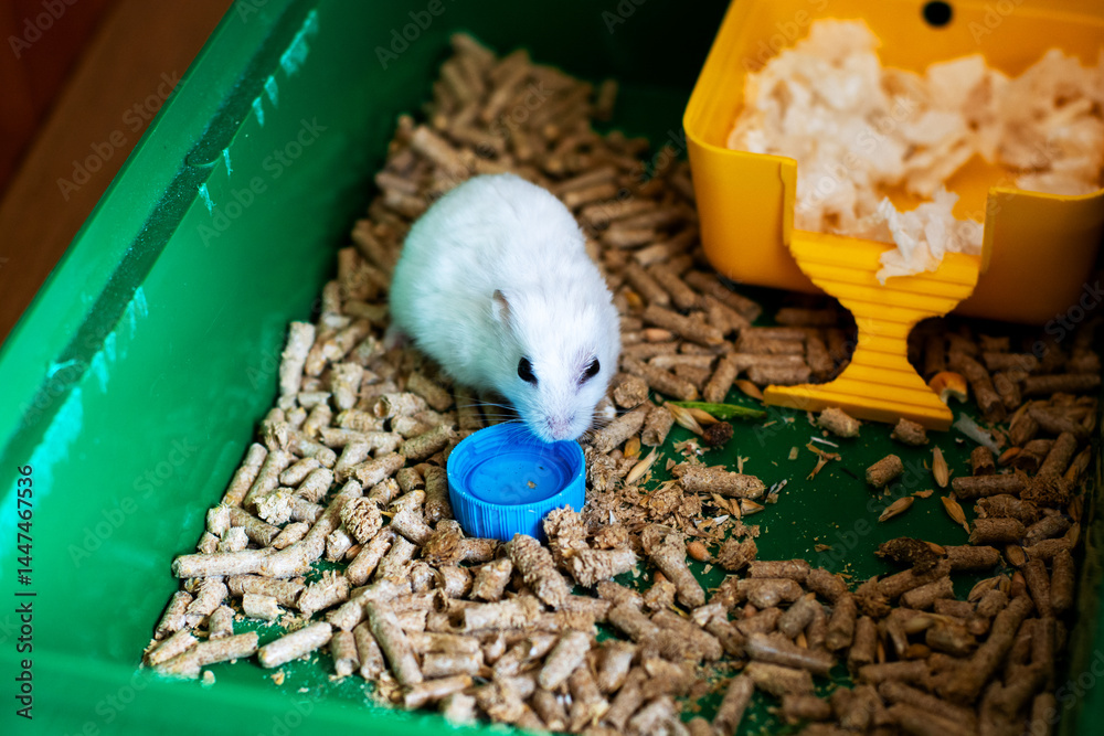 A Tiny White Hamster Enjoys a Drink from a Blue Bottle Cap Inside Its Cozy Cage Environment