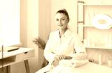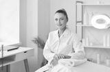 Portrait of professional beautician or cosmetologist at work. Young confident beautiful self made woman owner of beauty parlor or dermatological practice sitting by bed with clean white towels