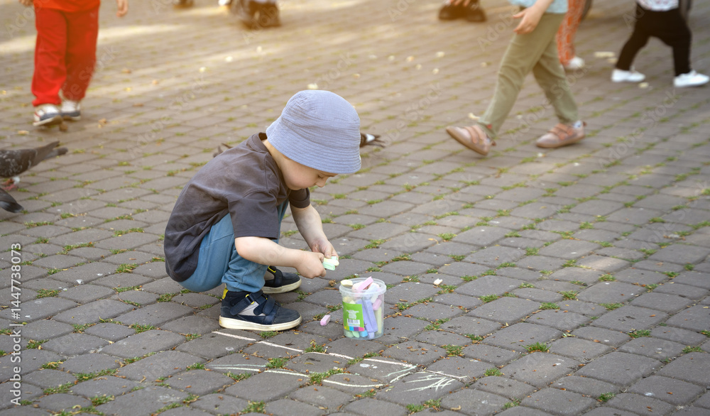 Little toddler boy four old draws with crayons in the park on tiles. Playtime for children. Children's games. Selective focus