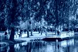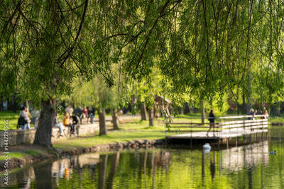 Beautiful view of a spring city park with lake, bridge and ducks. Springtime landscape. Ivano-frankivsk. Focus on the tree branches in the foreground at the top