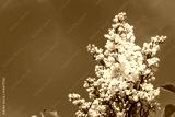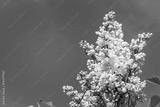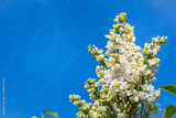 Photo of flowering branch of lilac in spring against the blue sky. Shallow depth of field