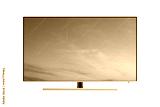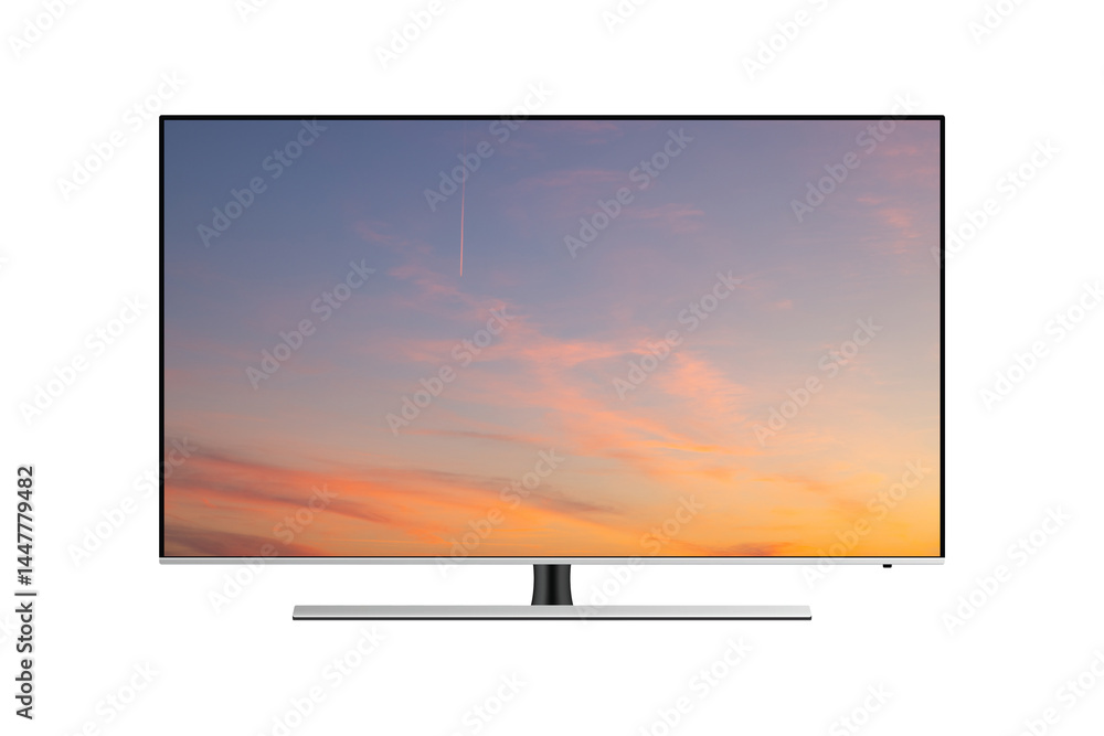 Flat screen TV from angled view with rural landscape with straw roll and sunset sky on screen