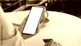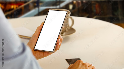 Woman's hands holding phone and credit card, sitting at the table in the in-store cafe in shopping mall. Copy space for product and e-commerce and shopping online and cashless transaction concept.