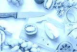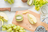 Raw green ingredients for smoothie, whole and cut apples, chopped celery stalk on a wooden board on white cloth background. Preparing for a healthy drink