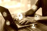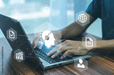 Professional Using Laptop With AI User-Profile and Network Visualization Overlay