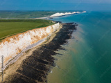 Aerial drone view over the famous, white cliffs of The Seven Sisters Dover, south England.