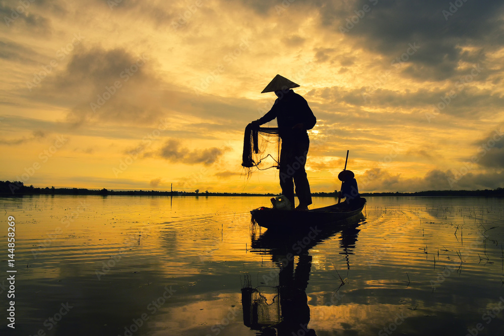 Fishermen catch fish on a boat in Asia