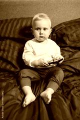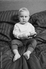 Cheerful toddler boy sitting on bed and playing on smartphone during day at home. Close up of child sitting on bed holding smartphone at home. Smiling child with mobile.