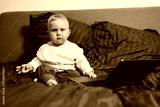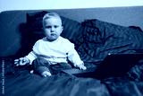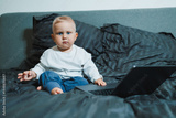 Stylish blond toddler boy sitting on bed and playing with laptop at home in bedroom. Child with tablet computer watching cartoons. White cozy interior in bedroom.
