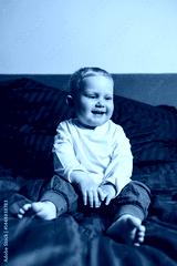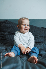 Cute toddler boy in white shirt and pants laughing while sitting in bed. 2 year old boy playing while sitting in bed. Home clothes for boys.