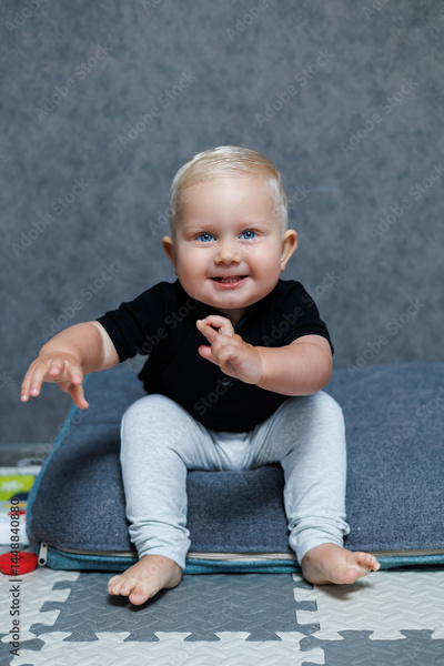 Blue-eyed blond boy 2 years old playing at home in the room. Toddler boy smiling looking at the camera. Home clothes for children.