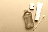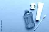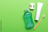 Mouthwash and other oral hygiene products on colored table top view with copy space. Flat lay. Dental hygiene. Oral care products and space for text on light background. concept