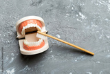 Closeup model of a human jaw with white teeth and Toothbrush. Dentistry conceptual photo. Prosthetic dentistry. False teet top view with copy space